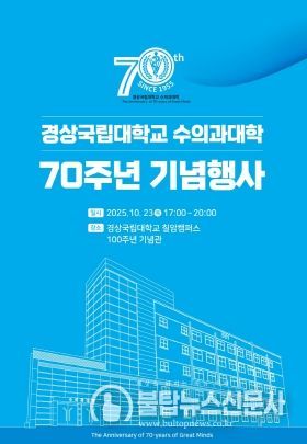 경상국립대학교 수의과대학은 설립 70주년을 맞이하여 70년 개척의 역사를 바탕으로 미래 100년을 향한 새로운 비상을 기념하기 위해, 10월 23일 오후 5시 칠암캠퍼스 100주년 기념관에서 ‘70년 개척의 자부심, 100년을 향한 새로운 비상’이라는 슬로건으로 ‘경상국립대학교 수의과대학 70주년 기념행사’를 개최한다.