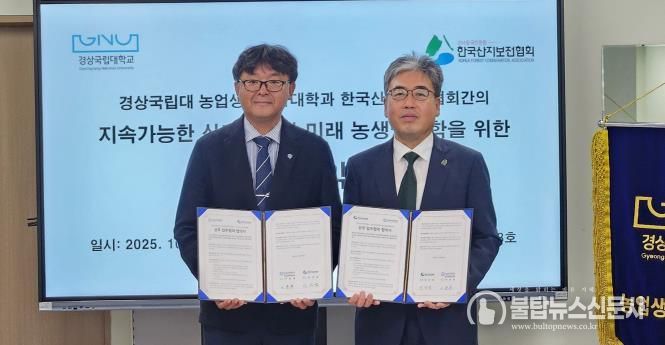 불탑뉴스신문사 차복원 기자 | 경상국립대학교 농업생명과학대학과 한국산지보전협회는 10월 28일 농업생명과학대학 학장실에서 산지분야 공동 기술연구 및 맞춤형 교육훈련을 통해 전문인력을 양성하는 업무협약을 체결했다.