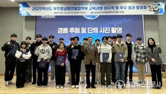 불탑뉴스신문사 차복원 기자 | 경상국립대학교(GNU·총장 권진회) 우주항공대학(CSA·학장 허기봉)은 10월 29일 가좌캠퍼스 항공우주산학협력관(407동)에서 ‘2025학년도 1학기 우주항공방산융합학부 교육과정 이수식 및 우수 이수 성과 발표회’를 개최했다.