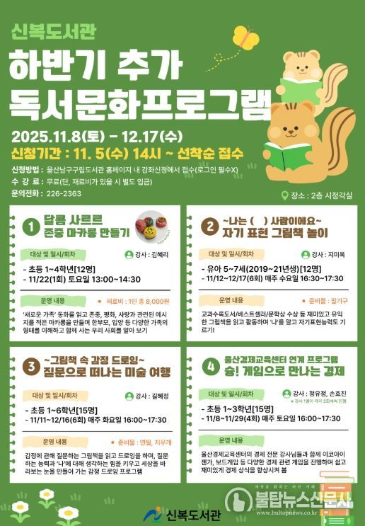 불탑뉴스신문사 차복원 기자 | 울산 남구 신복도서관은 11월을 맞아 지역 주민들에게 더욱 다양한 독서문화활동과 평생교육의 기회를 제공하기 위해 ‘하반기 추가 독서문화프로그램’을 운영한다고 밝혔다.