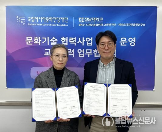 16일 전남대에 따르면 전남대학교 BK21 휴먼케어 지능형 문화예술콘텐츠의 디자인융합인재양성 교육연구단(아트&디자인테크놀로지 협동과정·단장 정정호 교수)과 국립아시아문화전당재단 융합미디어사업단은 지난 11일 문화기술 융합 연구개발 및 창의인재 양성을 위한 업무협약(MOU)을 체결했다.