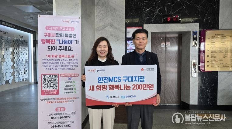 불탑뉴스신문사 차복원 기자 | 구미시는 지난 18일 한전MCS 구미지점(지점장 정경우)으로부터 '새 희망 행복나눔' 성금 200만원을 기탁받았다.