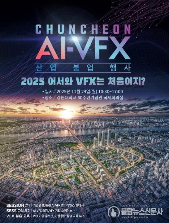 불탑뉴스신문사 차복원 기자 | 춘천시는 2025년 11월 24일 강원대학교 60주년 기념관 국제 회의실에서 ‘춘천 AI-VFX 산업붐업행사 – 2025 어서와! VFX는 처음이지?’를 개최한다고 밝혔다.
