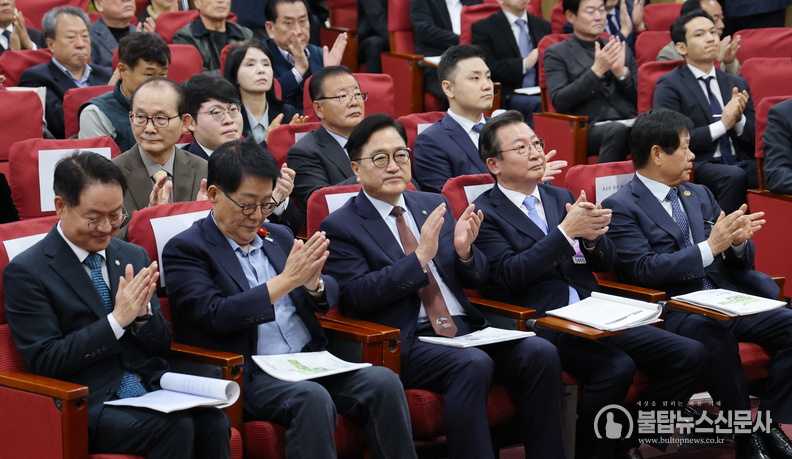 ▲국회의원회관에서 열린 '남북 유소년 축구 원산 대회 개최를 위한 정책 토론회'에 참석해 박수를 치고 있다.(사진출처=국회사무처)