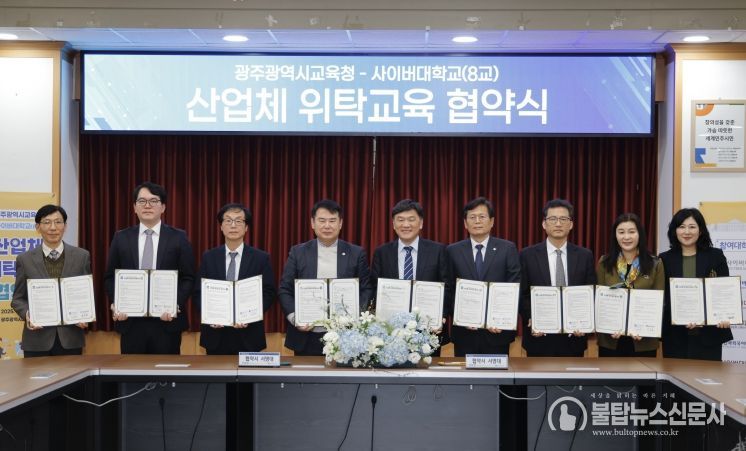 시교육청은 27일 중회의실에서 이정선 교육감, 국제사이버대학교 홍승정 총장, 서울사이버대학교 이은주 총장, 원광디지털대학교 김윤철 총장, 사이버한국외국어대학교 김병철 총장 직무대행, 한양사이버대학교 정현철 부총장, 경희사이버대학교 신봉섭 부총장, 건양사이버대학교 이진경 입학홍보처장, 고려사이버대학교 백창현 입학처장 등이 참석한 가운데 ‘산업체 위탁교육 업무협약’을 체결했다.