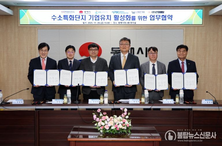 불탑뉴스신문사 차복원 기자 | 동해시는 11월 28일 동해시청 본관 2층 회의실에서 강원특별자치도, 피케이밸브앤엔지니어링㈜, ㈜성원기업, ㈜진화메탈, ㈜GS동해전력과 함께 수소특화단지 기업유치 활성화를 위한 업무협약(MOU)을 체결했다고 밝혔다.