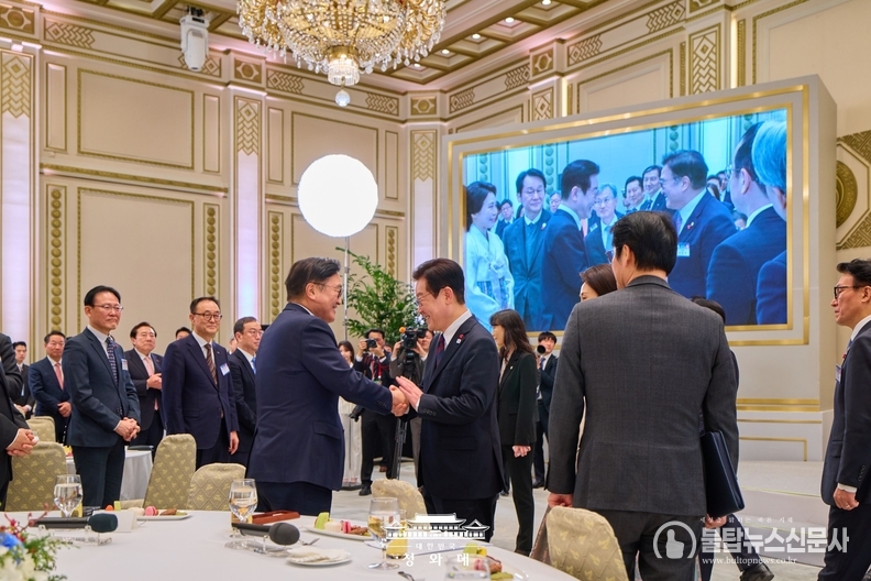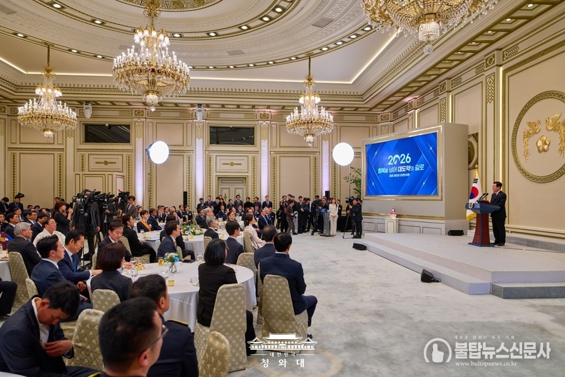(불탑뉴스=차복원기자) 이재명 대통령과 김혜경 여사는 2026년 병오년 새해를 맞아 2일 오후 2시 청와대 영빈관에서 국가 주요 인사와 국민대표들을 초청해 신년인사회를 개최했다.