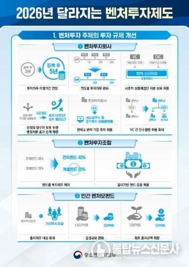 불탑뉴스신문사 송행임 기자 | 중소벤처기업부는 「벤처투자 촉진에 관한 법률」 및 하위법령(시행령, 시행규칙) 개정을 바탕으로 ’26년에 새롭게 달라지는 벤처투자 제도를 발표했다고 밝혔다.