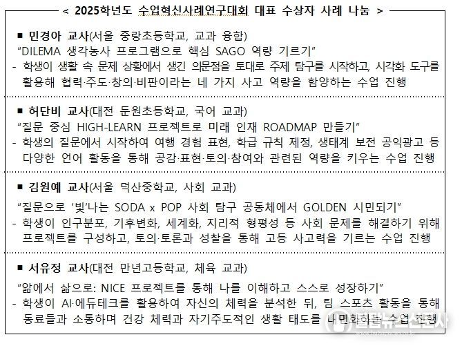 이번 시상식은 지속적인 연구로 수업 혁신을 이끌어 온 교사들의 노력을 알리고, 수업 경험을 공유하며 우수 수업사례를 전국적으로 홍보・확산하기 위해 마련됐다.