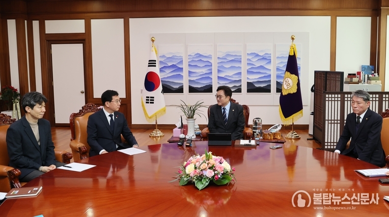 ▲우원식 국회의장이 7일(수) 의장집무실에서 국민투표법 개정 간담회를 진행하고 있다. 왼쪽부터 윤건영 국회 행정안전위원회 간사, 신정훈 국회 행정안전위원장, 우 의장, 정재황 국민 미래 개헌자문위원장.(사진=국회사무처 사진팀)