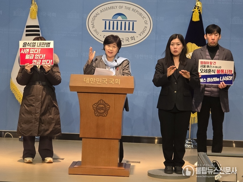 한파 속 서울 시내버스 파업이 이틀째 이어지며 시민들의 고통이 가중되는 가운데, 서영교 의원이 서울시의 무책임한 행정을 강하게 비판하며 즉각적인 버스 운행 정상화를 촉구하는 기자회견을 국회소통관 기자회견장에서 가졌다.