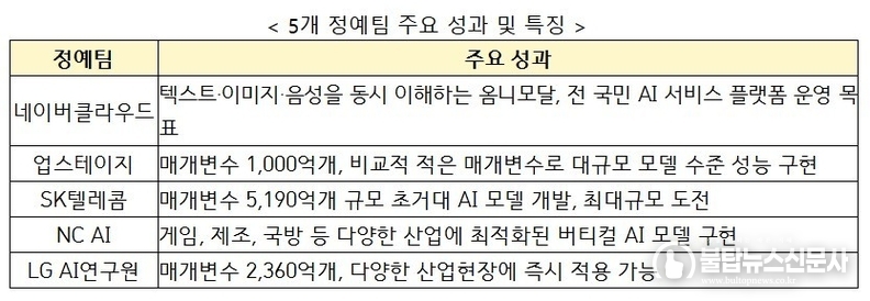 지난 2025년 8월 선발된 5개 정예팀(네이버클라우드, 업스테이지, SKT, NC AI, LG AI연구원)은 치열한 기술 경쟁을 벌여왔다. 그 결과 이들이 개발한 모델 5개 모두 미국 Epoch AI의 '주목할만한 AI 모델(Notable AI Models)'에 등재되는 쾌거를 이뤘다.