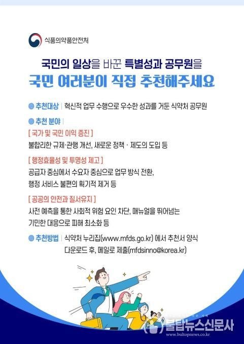 불탑뉴스신문사 차복원 기자 | 식품의약품안전처는 국민이 체감하는 탁월한 성과를 창출한 공무원을 국민이 직접 추천해 포상하는 ‘국민추천제’를 1월 20일부터 운영한다고 밝혔다.
