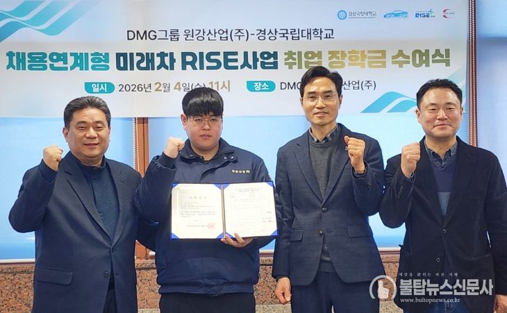 불탑뉴스신문사 차복원 기자 | 경상국립대학교는 2월 4일 오전 11시 함안군에 소재한 원강산업(주) 회의실에서 ‘채용연계형 미래차 RISE사업 취업 장학금 수여식’을 개최했다.