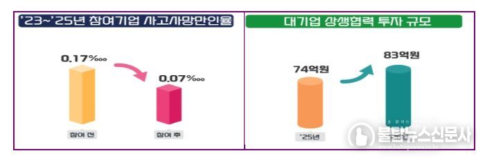 올해는 대기업 220곳이 중소기업 3,160곳과 함께 참여한다. 상생협력 투자 금액은 지난해보다 11.3%(74→83억 원) 증가할 예정이고, 사망·중상해 재해가 발생한 고위험 협력업체, 거래관계가 없는 지역 중소기업 등 안전관리 손길이 필요한 분야에 대한 지원을 강화한다.