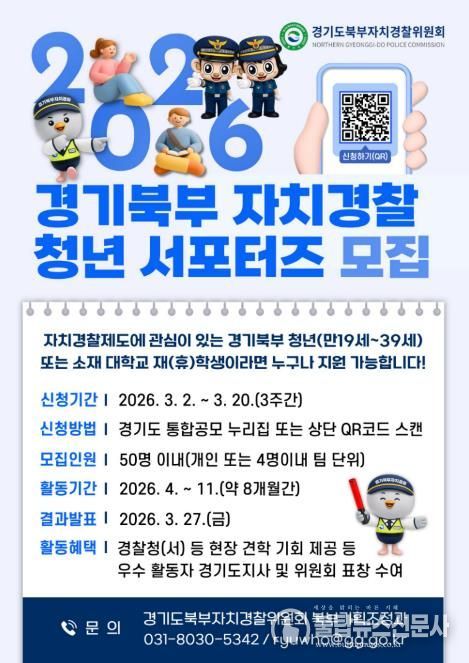 불탑뉴스신문사 차복원 기자 | 경기도북부자치경찰위원회는 자치경찰제에 대한 청년층의 관심을 높이고 현장 중심 치안 활동을 함께할 ‘2026 경기북부 자치경찰 청년 서포터즈’를 3월 2일부터 20일까지 공개 모집한다.
