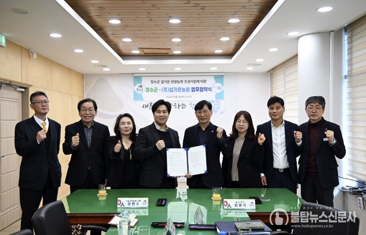 이날 협약식에는 최훈식 장수군수를 비롯해 정현수 ㈜설가온농원 대표, ㈜광화문아띠 관계자 등 10여 명이 참석한 가운데 진행됐다.