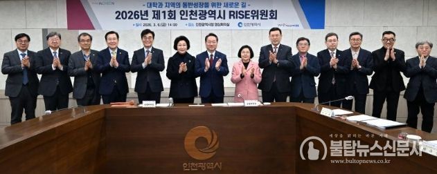 불탑뉴스신문사 차복원 기자 | 인천광역시는 3월 6일 시청 영상회의실에서 ‘2026년 제1회 인천광역시 라이즈(RISE) 위원회’를 개최하고, 인천형 RISE 사업의 고도화 방안과 2026년 시행계획, 성과관리 방안(자체평가)을 심의‧의결했다.
