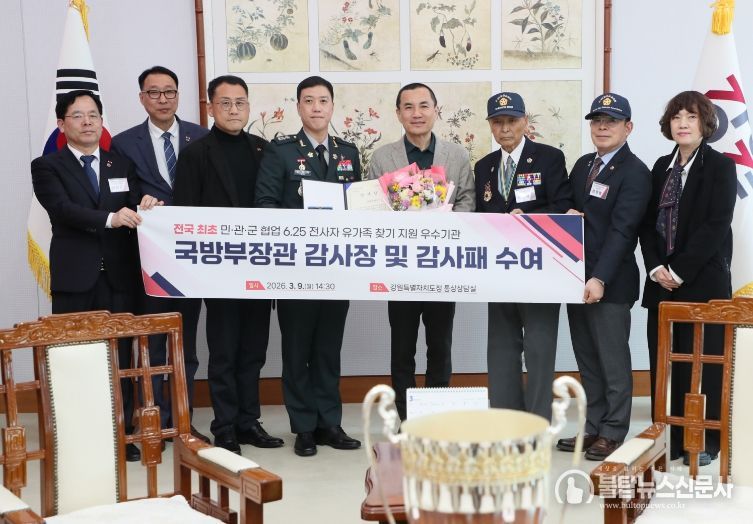 불탑뉴스신문사 차복원 기자 | 강원특별자치도는 국방부 유해발굴감식단이 추진한 ‘2025년 민·관·군 협업 6·25전사자 유가족 집중 찾기’ 사업에서 전국 최초 민관군 협업 6.25전사자 유가족 찾기 지원 우수기관으로 선정돼, 3월 9일 국방부장관으로부터 감사장과 감사패를 수상했다고 밝혔다.
