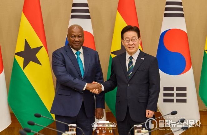 불탑뉴스신문사 차복원 기자 | 이재명 대통령은 11일 오후 우리나라를 실무 방한한 존 드라마니 마하마 가나 대통령과 정상회담을 가졌다고 강유정 청와대 대변인이 서면 브리핑을 통해 밝혔다.