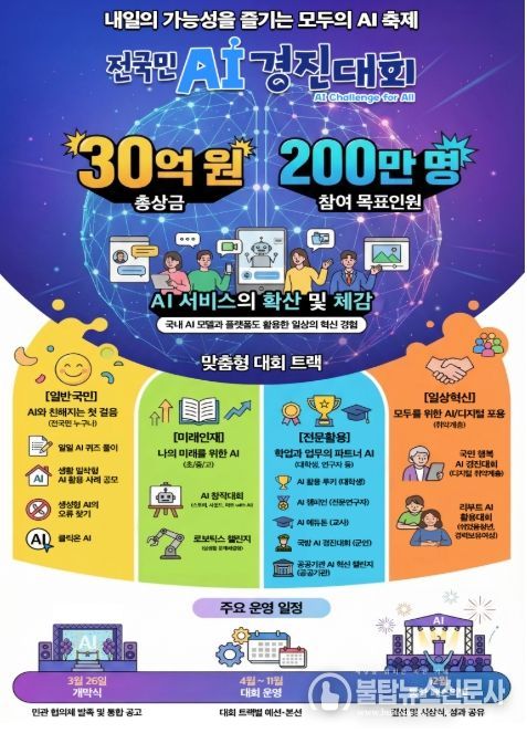 「전국민 AI 경진대회」는 3월 26일(목) 개최되는 국민이 참여하는 개막식을 통해 공식 시작을 알리고, 4월부터 11월까지 대회를 운영한 뒤 연말 개최되는 AI 페스티벌을 통해 총 상금 30억원 규모로 우수 성과를 시상할 계획이다.