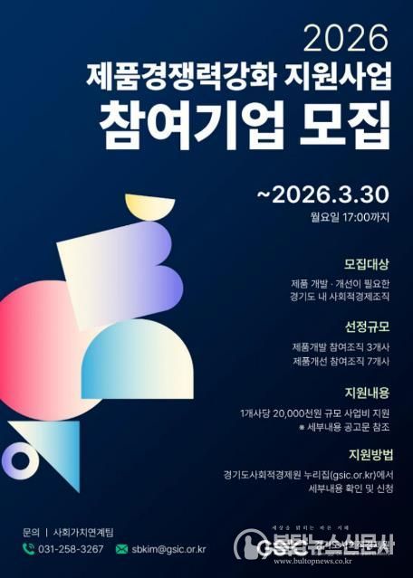 참여를 희망하는 기업은 30일 오후 5시까지 경기도사회적경제원 누리집(gsic.or.kr)을 통해 온라인으로 신청하면 된다. 자세한 사항은 경기도사회적경제원 사회가치연계팀에서 안내받을 수 있다.