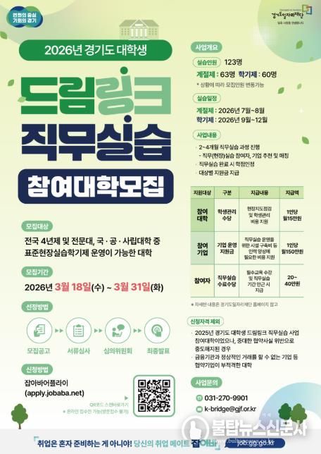 불탑뉴스신문사 차복원 기자 | 경기도와 경기도일자리재단이 ‘경기도 대학생 드림링크 직무실습’ 사업에 참여할 15개 협력대학을 31일까지 모집한다.