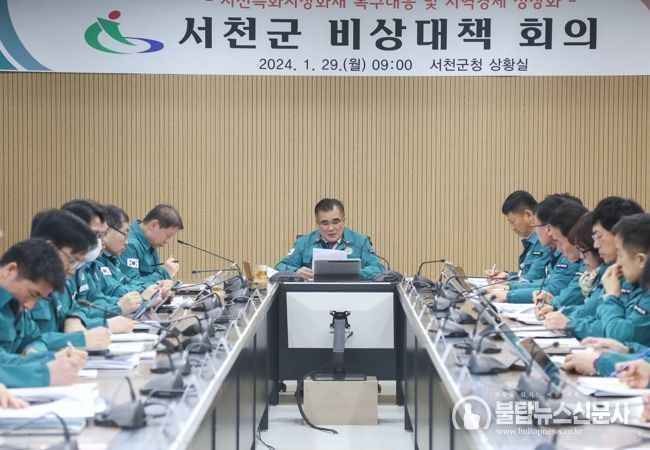 불탑뉴스신문사 한기석 기자 | 서천군이 29일 군청 상황실에서 김기웅 서천군수 주재로 부군수, 국장 등 전 부서장이 참석한 가운데 서천특화시장 화재 복구대응 비상대책 회의를 개최했다.