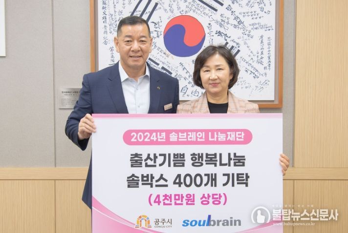 이날 기탁식을 통해 솔브레인나눔재단은 공주시 출생아를 축하하고 저출산 극복을 위해 4천만원 상당의 출산용품 세트(아기띠와 유기농 침받이 400개)를 지원했다.
