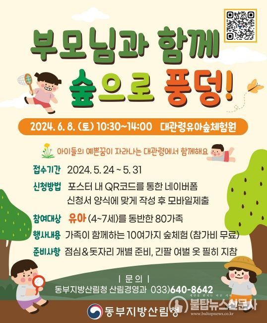 불탑뉴스신문사 송행임 기자 | 동부지방산림청(청장 최수천)은 오는 6월 8일 토요일에 평창군 소재 대관령 유아숲체험원에서 ‘부모님과 함께 숲으로 풍덩!’ 행사를 개최한다고 23일 밝혔다.