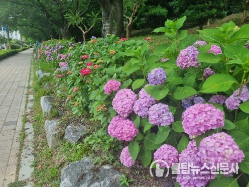 사상구는 낙동제방과 낙동대로 일부 구간에 수국 4천여 주를 식재하고 꽃길을 조성해 아름다움을 선사하고 있다.
