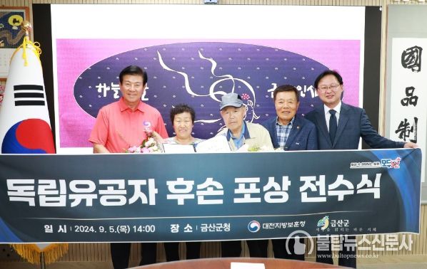 불탑뉴스신문사 한기석 기자 | 금산군은 지난 9월 5일 국가보훈부 대전지방보훈청과 함께 금산군청에서 독립유공자 고 원인성 지사의 손자 원동수 씨에게 대통령 표창을 전수했다.
