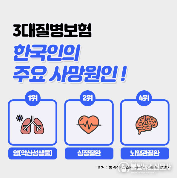 불탑뉴스신문사 차복원 기자 | 흔히 3대질병이라 일컫는 암, 심혈관질환, 뇌혈관질환은 통계청 발표자료에 따르면 한국인의 주요 사망원인 중에서 3위 폐렴을 제외하고 1~4위를 차지하고 있으며, 이전부터 지금까지도 살면서 가장 먼저 대비해야 하는 치명적인 질병으로 강조되고 있다. 이러한 중대질병에 대비하기 위하여 상기 세가지 치명적인 질병을 집중보장하는 3대질병진단비보험을 많이 가입하고 있다. 3대진단비보험은 각각의 질병을 중점적으로 보장하면서도 가입자 특성에 맞는 특약을 추가함으로써 종합건강보험으로도 활용할 수가 있다.