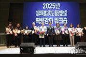 불탑뉴스신문사 한기석 기자 | 지역 현장의 최일선에서 주민과 행정을 연결하는 핵심 역할을 수행하는 제주특별자치도 통장협의회가 6일 지역 발전과 상호 교류를 확대하기 위한 소통의 자리를 마련했다. 이번 출범식은 올해 8월 1일 출범한 제주도 통장협의회의 첫 공식 행사다. 제주특별자치도는 이날 오전 제주국제컨벤션센터에서 도내 31개 동 지역 통장 600여 명이 참석한 가운데 ‘2025년 제주특별자치도 통장협의회 역량강화 워크숍’이 개최됐다고 밝혔다. 이번 워크숍에서는 올해 지역발전을 위해 기여한 우수 통장 31명이 장관, 도지사, 도의회의장 표창 및 도교육감 감사패를 받았다. 특히 김도연 회장은 올해 도 단위 통장협의회 출범을 이끈 공로를 인정받아 행정안전부장관 표창을 수상했다. 이후 특강에서는 국제웃음치료협회 한광일 회장이 ‘즐거운 소통 리더십’을 주제로 통장의 역할과 임무를 유쾌하게 풀어내며 참석자들의 큰 호응을 얻었다. 김도연 회장은 인사말을 통해 “2025년 도 통장협의회가 결성된 만큼 앞으로 도내 통장들이 하나로 연대해 주민과 함께 도정 정책 실행에 적극 동참하겠다”는