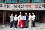 불탑뉴스신문사 송행임 기자 | 부산 동래구는 지난 8일 온천동 소재 태고종 원광사로부터 추석 맞이 성품 쌀 10kg 300포을 기탁받았다고 밝혔다. 지광 큰스님은 “코로나 이후 많은 나눔을 베풀지 못했지만, 원광사 신도들의 변함없는 뜻이 자비의 손길로 하나 되어 꾸준히 대중공양을 나눌 수 있어 감사하다”라며 “앞으로도 부처님의 자비 정신을 바탕으로 지역을 위해 아낌없이 봉사하겠다”라고 전했다. 장준용 동래구청장은 “변함없이 지역을 위해 나눔을 실천해 주시는 원광사 주지 큰스님과 신도회에 감사드리며, 앞으로도 변화와 혁신으로 구민 모두가 행복한 동래를 만들 수 있도록 최상의 복지를 위해 최선을 다하겠다”라고 말했다. 금정산 태고종 원광사는 2005년부터 매년 부산 지역의 어려운 이웃을 위해 백미를 기탁 해오고 있으며, 이번 전달식에서 기탁받은 백미는 오는 추석을 맞이해 관내 시설 및 어려운 이웃들에게 배부될 예정이다.