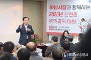 불탑뉴스신문사 차복원 기자 | 이현재 하남시장은 20일 감일동 행정복지센터에서 열린 ‘주민과의 대화’에서 “방아다리길 연결도로 개통과 연계한 버스 노선 개편 및 생활 SOC 확충을 통해 감일신도시 주민들의 정주 여건을 개선하겠다”라고 밝혔다. 방아다리길 연결도로는 하남시 감일동과 서울시 송파구 방이동을 잇는 구간으로, 오는 2026년 6월 최종 준공될 예정이다. 이현재 시장은 “도로 개통에 맞춰 올림픽공원 방향으로 버스 노선을 집중 조정함으로써 주민들의 교통 편의를 높이겠다”라고 설명했다. 아울러 학생들의 안전한 보행 환경 조성을 위한 교량 신설 사업도 속도를 낸다. 신우초등학교 앞 인도교 확장 공사는 학생들의 안전을 고려해 오는 4월 준공할 예정이며, 10단지에서 8단지 상가를 연결하는 벌말천 인도교는 1월 중 주민설명회를 거쳐 6월 준공 및 개방을 목표로 하고 있다. 이 시장은 지역 문화 인프라 구축의 핵심인 감일 박물관 건립 상황도 공유했다. 감일지구 출토 유물을 전시할 박물관은 이달 중 건축 공사에 착공하며, 총 152억 원의 사업비를 투입해 2027년 하반기 준공될 예정이다. 다만, 감일종합복지타운은
