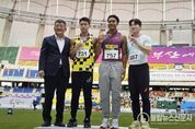 불탑뉴스신문사 차복원 기자 | 예천군 육상 직장운동경기부 나마디 조엘 진 선수가 제106회 전국체전에서 ‘스프린터 더블’(100m, 200m 동시 우승)에 이어 400m 계주에서도 금메달을 획득하며 3관왕을 달성했다. 대한민국의 육상 단거리 기대주 나마디 조엘 진 선수는 19일, 100m 10초 35로 금메달을 획득했으며, 다음날 20일에는 200m에서 현역 최강자 고승환(광주광역시청) 선수를 제치고 금메달을 획득한 데 이어 21일, 400m 계주에서도 금메달을 획득하여 대한민국 남자 단거리 최강자임을 다시 한번 확인했다. 앞서 조엘 진은 지난 9월 27일 홍콩에서 열린 제2회 동아시아 20세 이하(U-20)육상선수권대회 100m 예선에서 10초 26에 결승선을 통과하며, 자신의 종전 최고 기록(10초 30)을 0.04초 단축하는 등 이번 대회를 위해 철저히 준비를 해왔다. 조엘 진 선수는 “지난 시즌 내내 제 장점을 극대화하고 단점을 보완하는 훈련을 계속해왔던 것이 이번 전국체전에서 좋은 결과로 이어진 것 같다”며, “초반 스타트에서 뒤처지지 않으면서, 후반 가속력을 살릴 수 있었던 것이 3관왕의 핵심이었다”